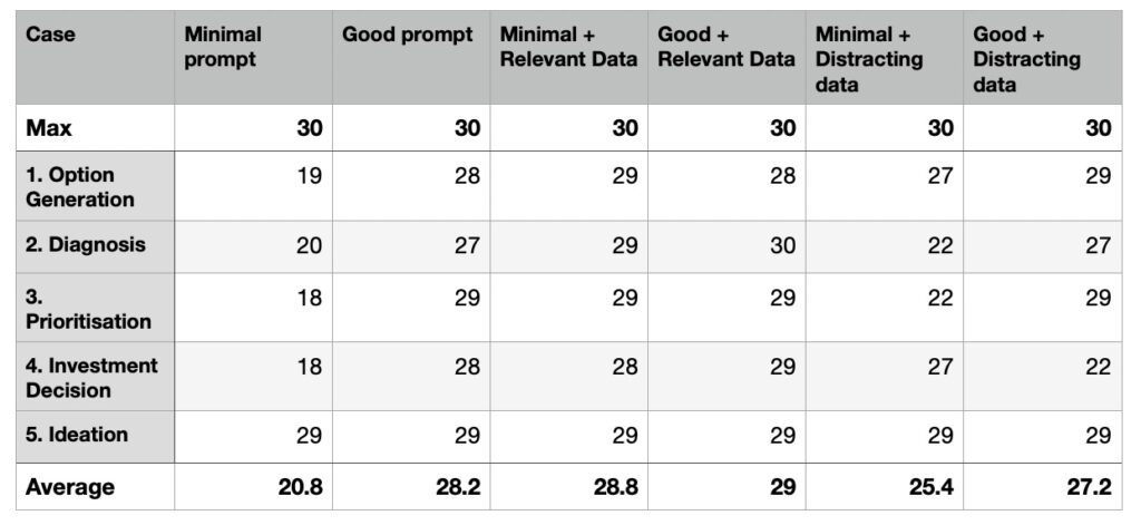 - All of the cases were fictitious but realistic and similar to real cases. It is highly likely that LLMs have been trained on similar cases and could therefore used learned patterns in answering the questions even given just a short prompt. This matches the current expected use by many business leaders of LLMs but the results of these experiments need to be read in this light.