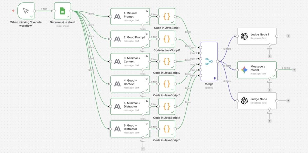 - I used n8n to set up my testing environment: to maintain a consistent flow holding as many variables constant as possible: same system and user prompts etc.